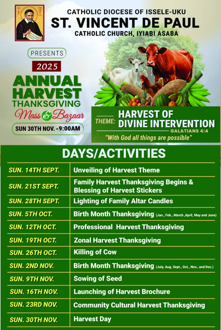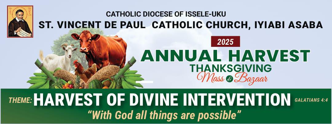 Announcement: We are calling on couples who have not done their wedding but are living together to grab the opportunity the parish is offering them to help them regularize their union with the Church. Kindly register with the priest or the members of the family and human life who may approach you to render some help. • Announcement: There will be infant Baptism on Saturday, August 30, 2025, by 5.00pm. Pre-baptismal briefing for parents and sponsors will hold on Friday, August 29, by 5.00pm. • Announcement: Good evening dear brothers and sisters in the Lord, Our parish website is now active and running online. Website: stvincentdepaulparishasaba.com We hereby request that all statutory groups and societies in the church send the list of their exco members to me on WhatsApp as soon as possible. God bless you all and do have a gracefilled evening. Parish Priest • Announcement: Today begins our harvest activities for the year. Let us come prepared for the choosing of our harvest theme. Happy Sunday Everyone! • Announcement: Come Sunday, the 14th day of September 2025, in all Masses, we shall be unveiling our 2025 harvest banner. Letbus all come prepared to make it a worthwhile event. God bless you all. • Announcement: Come Sunday, the 14th day of September 2025, in all Masses, we shall be unveiling our 2025 harvest banner. Letbus all come prepared to make it a worthwhile event. God bless you all. • Priestly Ordination Anniversary Celebrations : The 11th day of September 2025 was another memorable day in our parish as the parish Priest hosted his classmates of the 2004 set of Priests of the Catholic Diocese of Issele-Uku. • 2025 HARVEST OF DIVINE INTERVENTION: Harvest Banner Unveiled • 2025 HARVEST: Harvest of Divine Intervention •